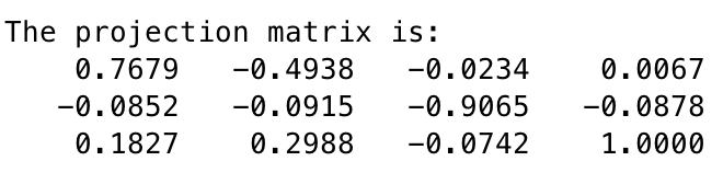 I was able to verify my calculated projection matrix to be correct by looking at the total residual value which came out to be 0.0445 with the normalized image & world coordinates. When switching to unnormalized coordinates, I observed a slight increase in total residual value to 15.6217, which is expected as the reason we normalize is to make the least squares solution more robust, and this verifies that preprocessed normalization worked.