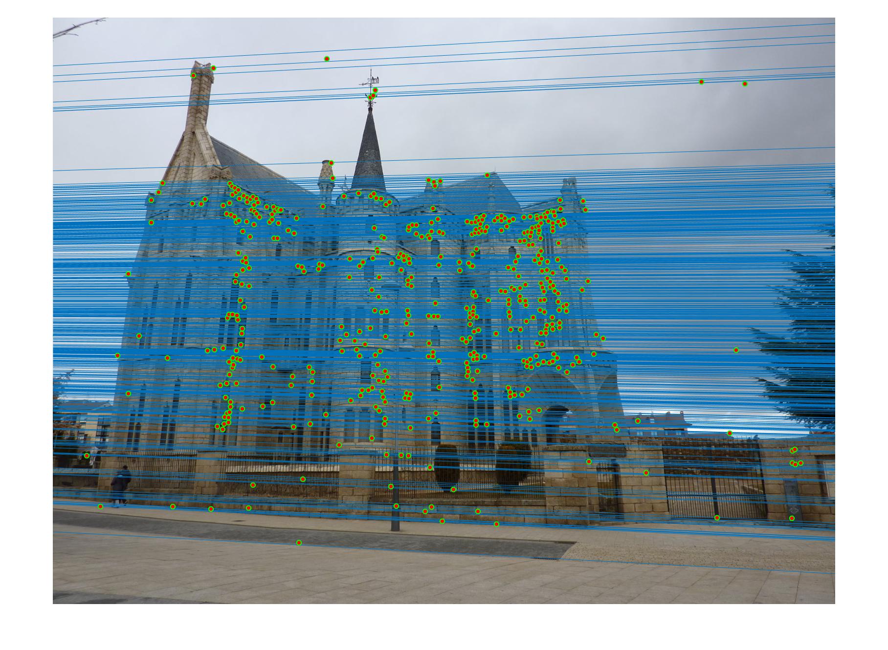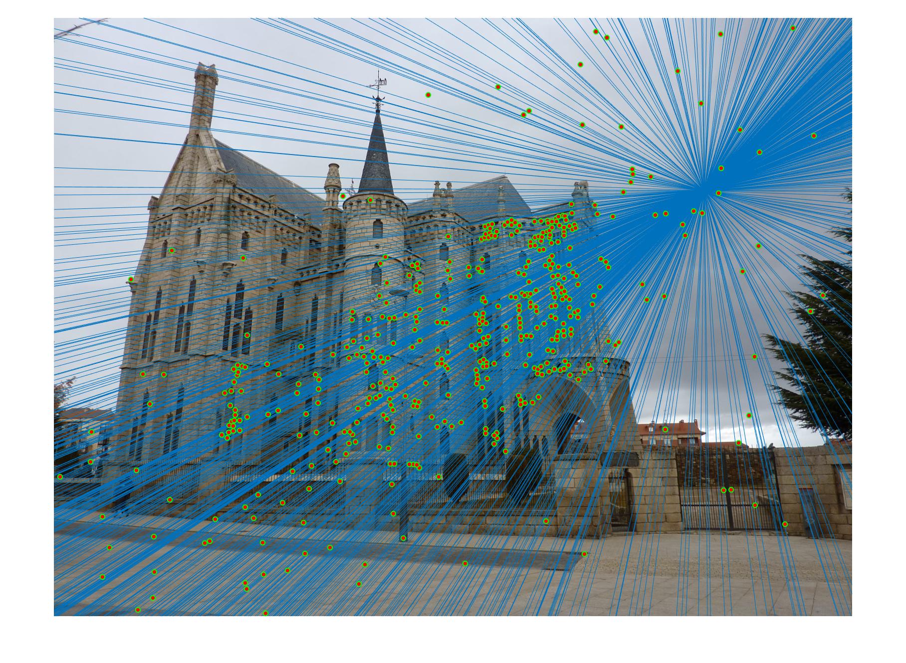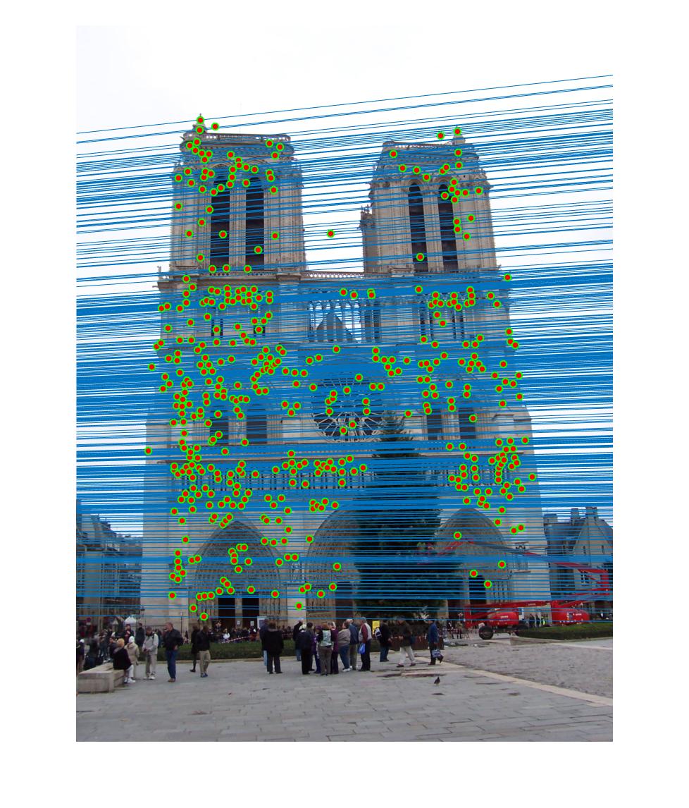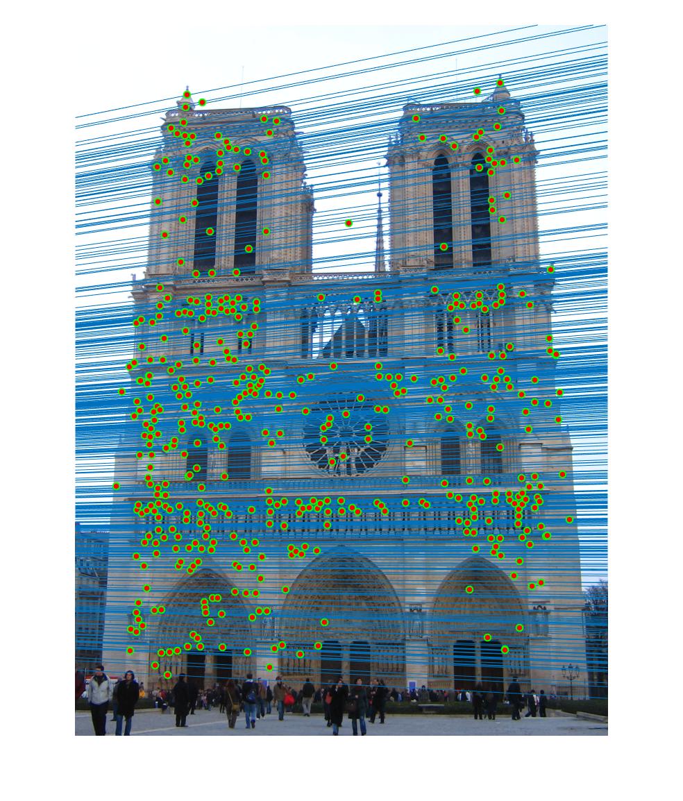 Fig 1. RANSAC on Gaudi images: 1500 iterations, inlier threshold = 0.03 gives 505 matching points with epipole out scope.