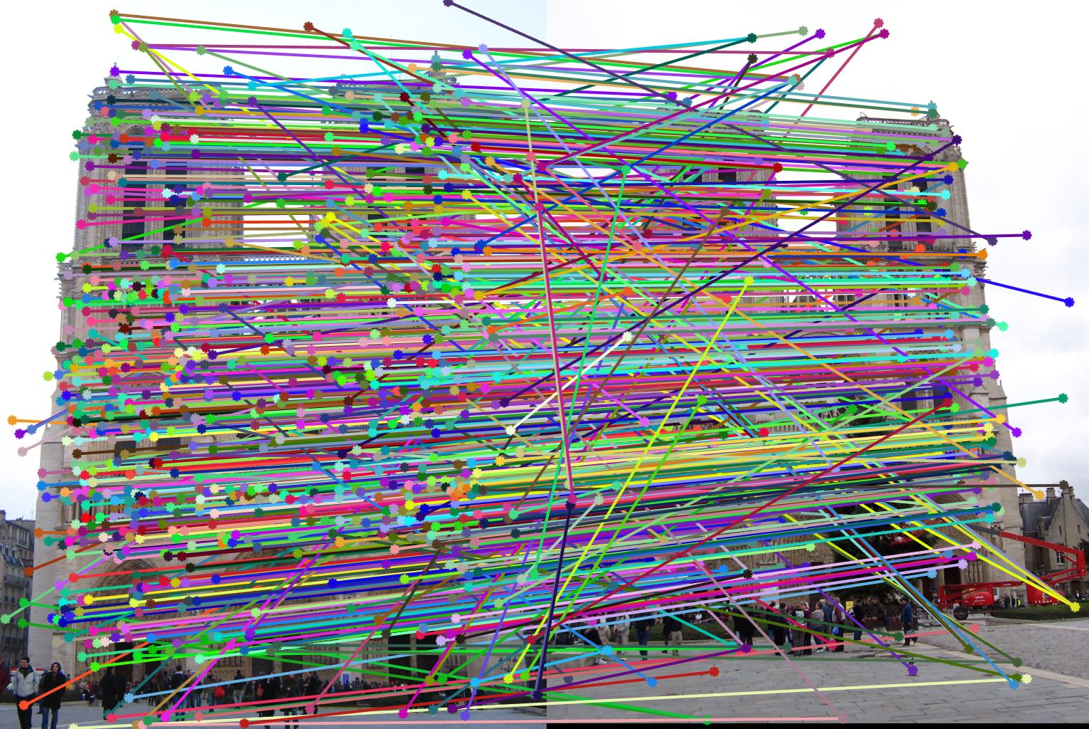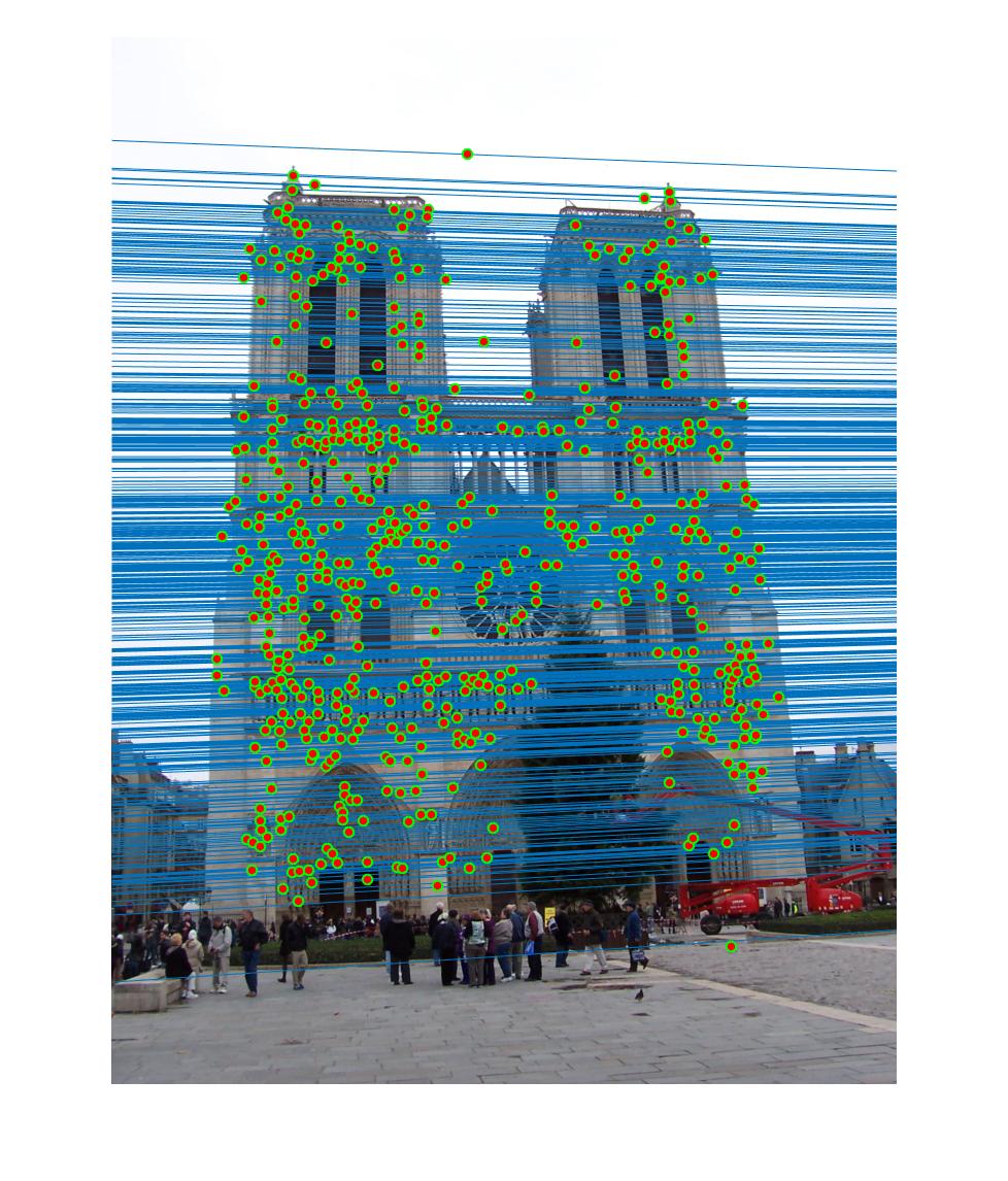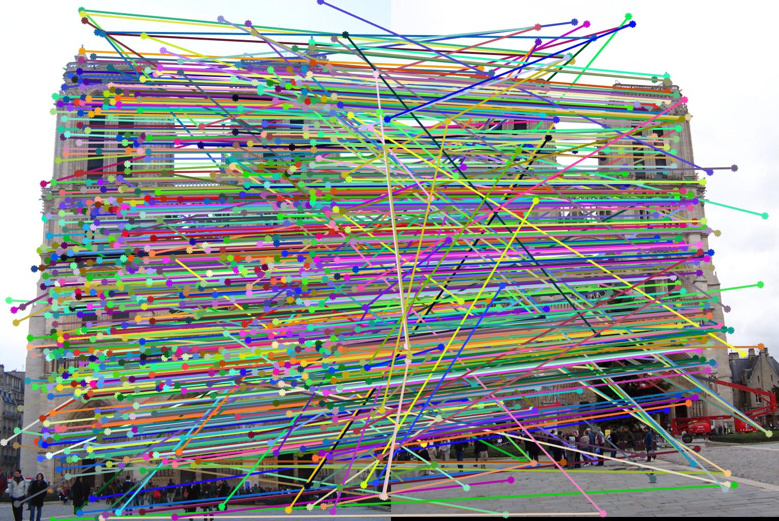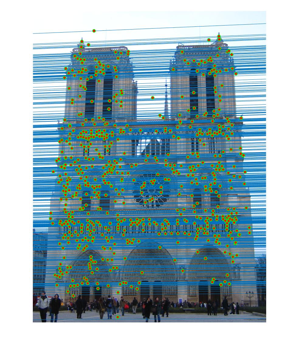 Fig 1. RANSAC on Gaudi images: 1500 iterations, inlier threshold = 0.03 gives 505 matching points with epipole out scope.