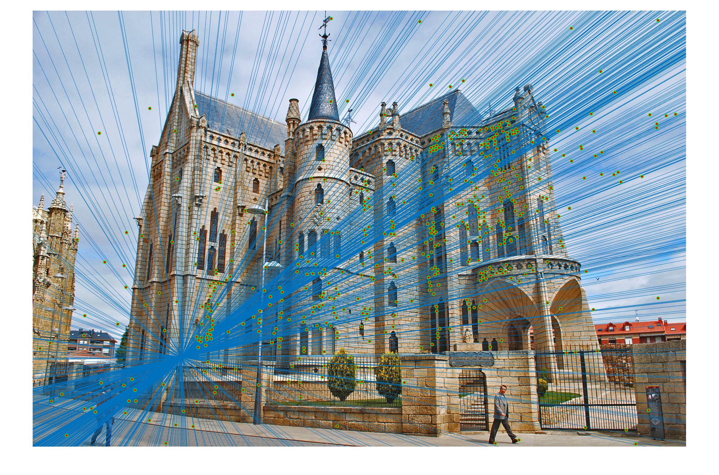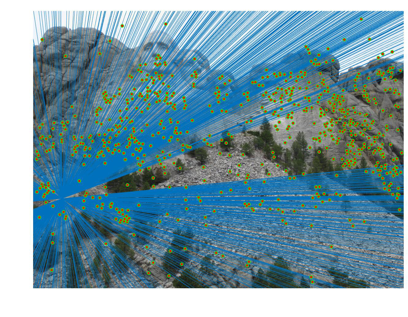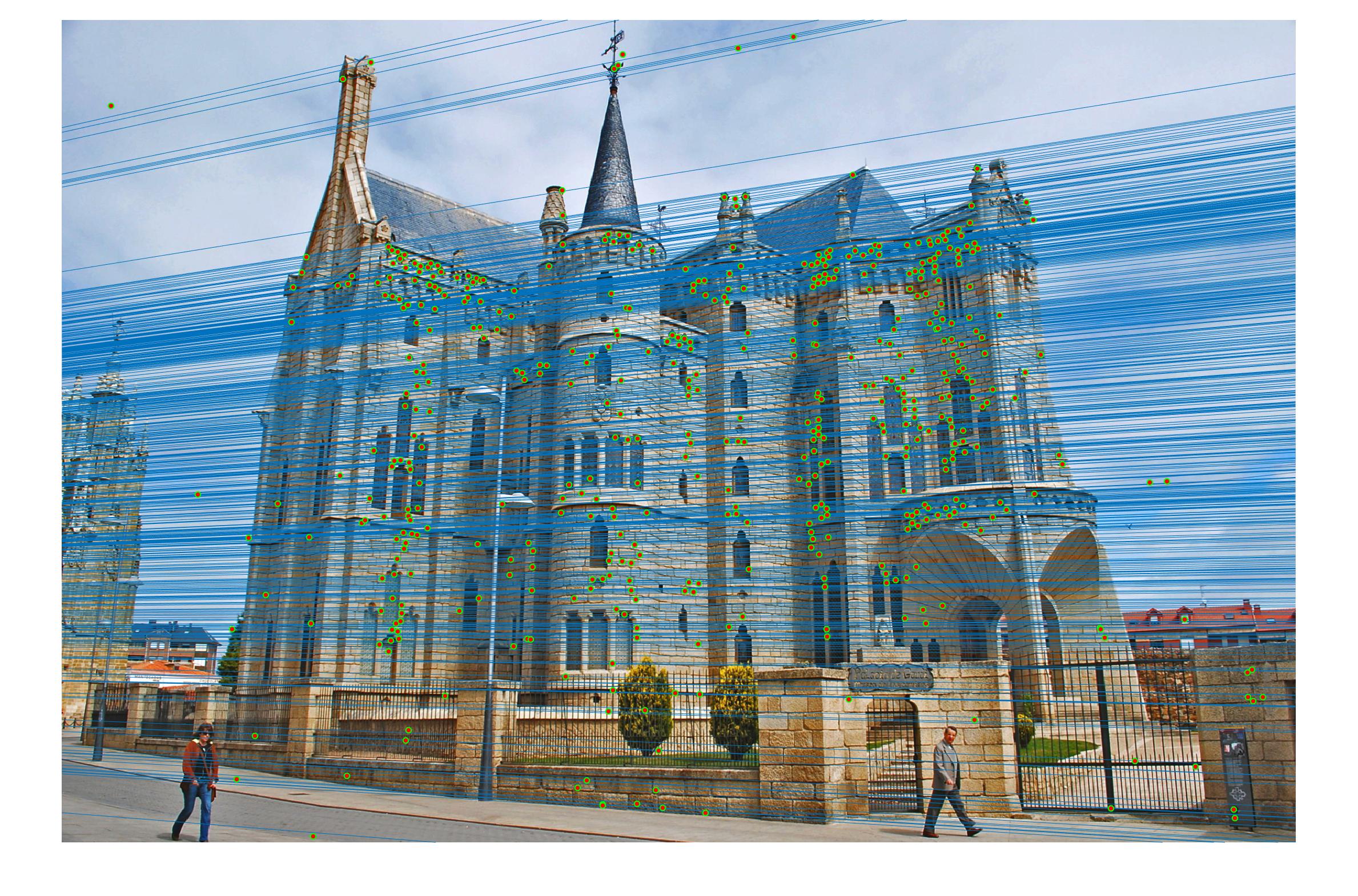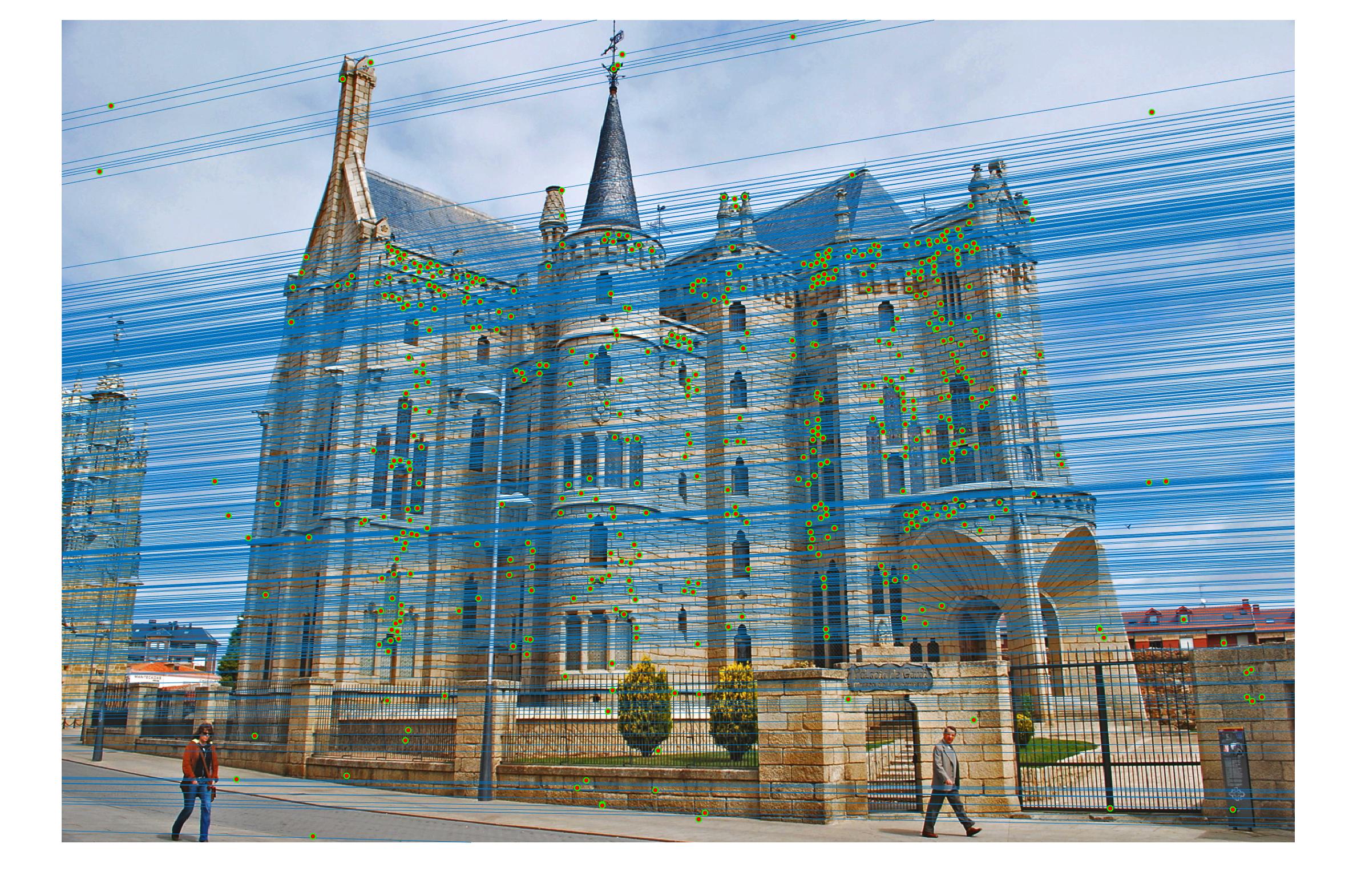 Fig 1. RANSAC on Gaudi images: 1500 iterations, inlier threshold = 0.03 gives 505 matching points with epipole out scope.