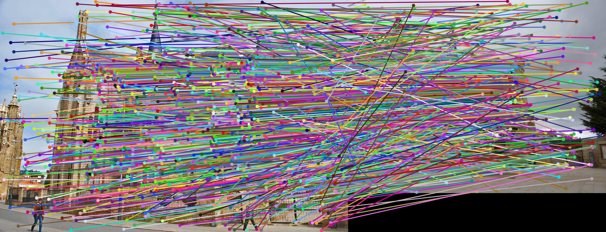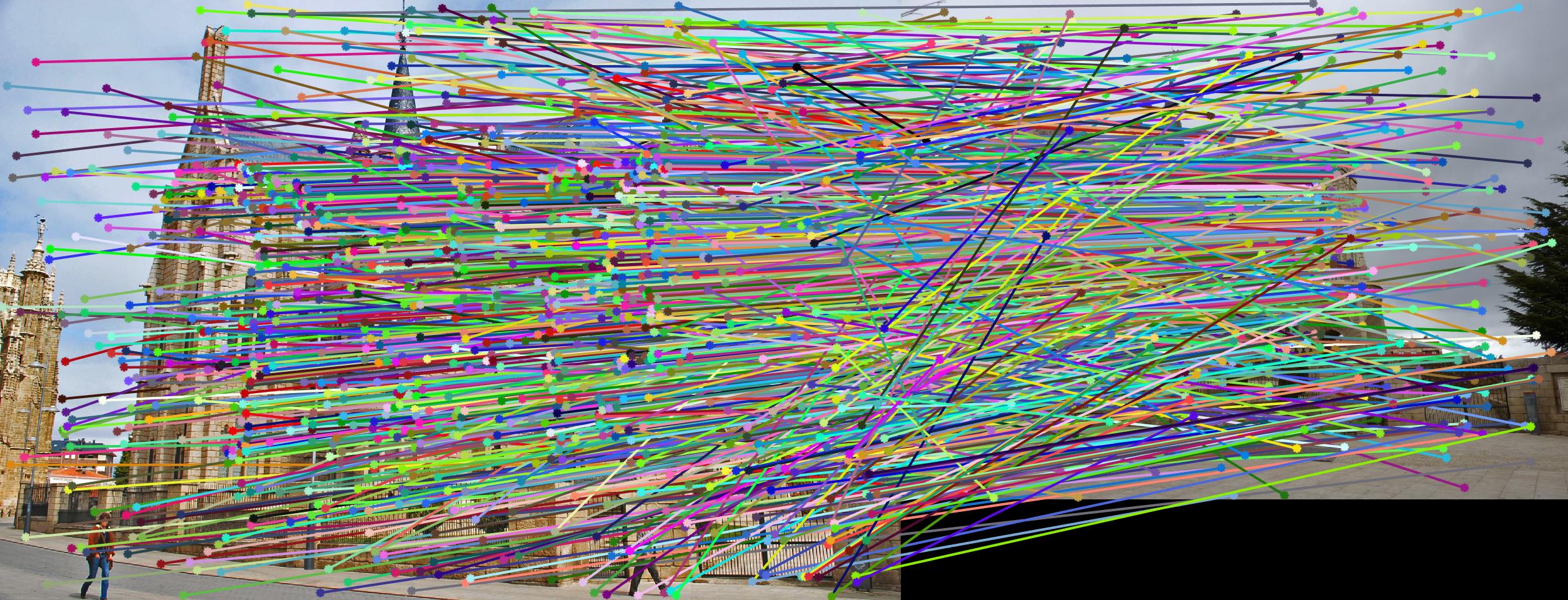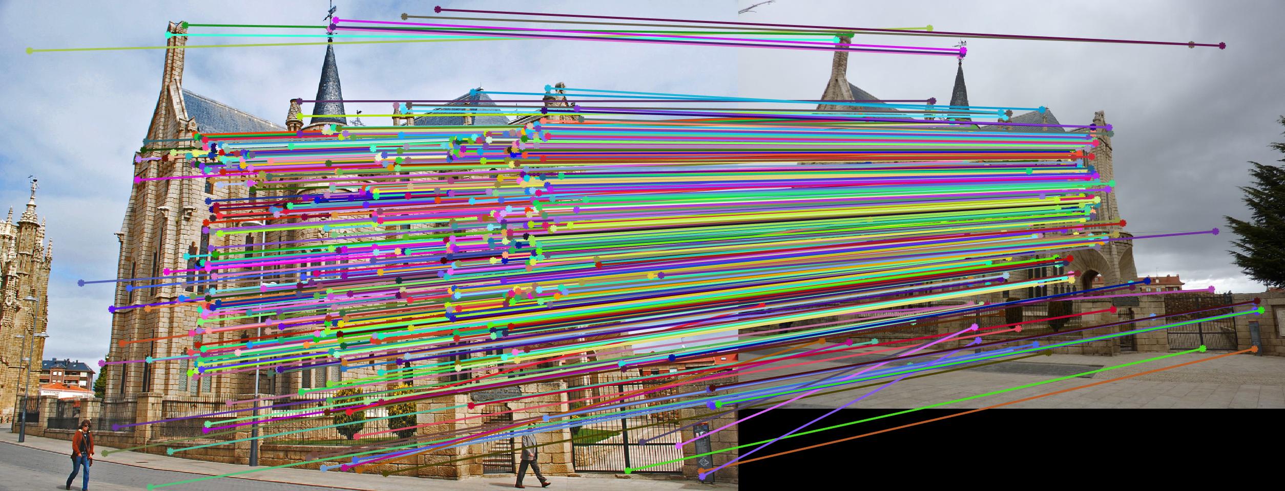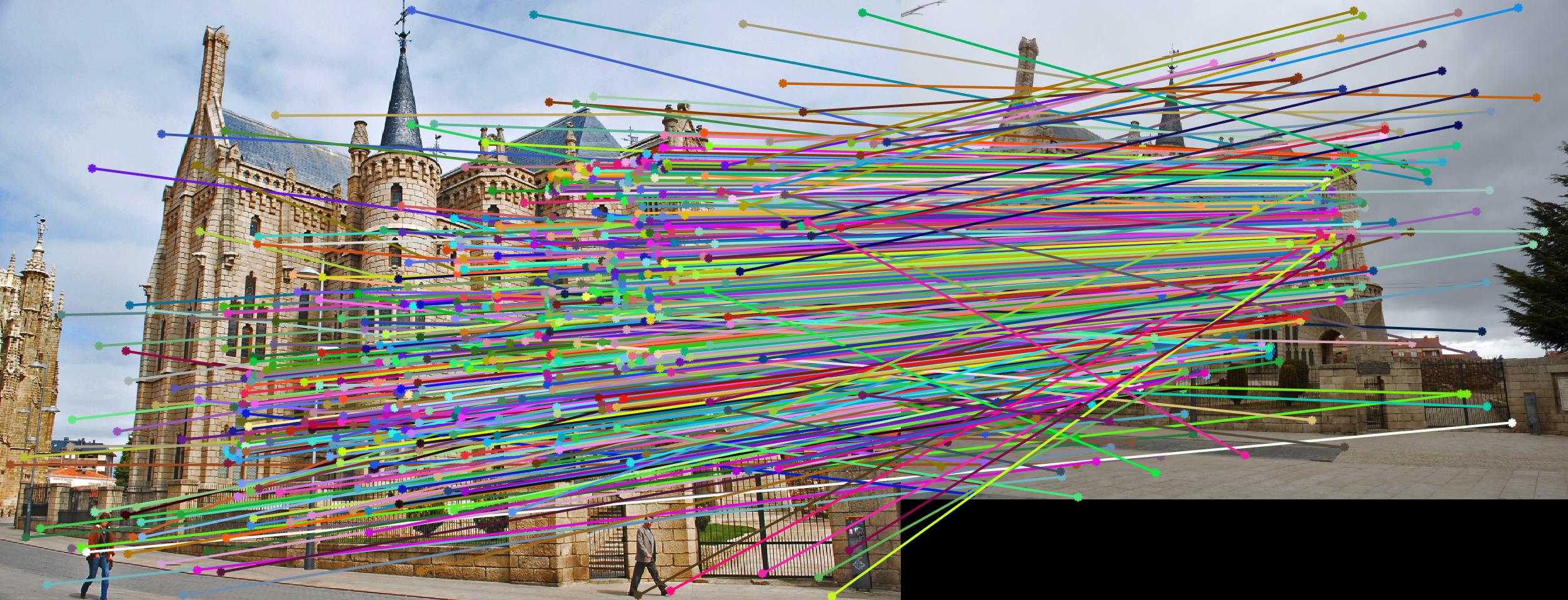 Fig 1. RANSAC on Gaudi images: 1500 iterations, inlier threshold = 0.03 gives 505 matching points with epipole out scope.
