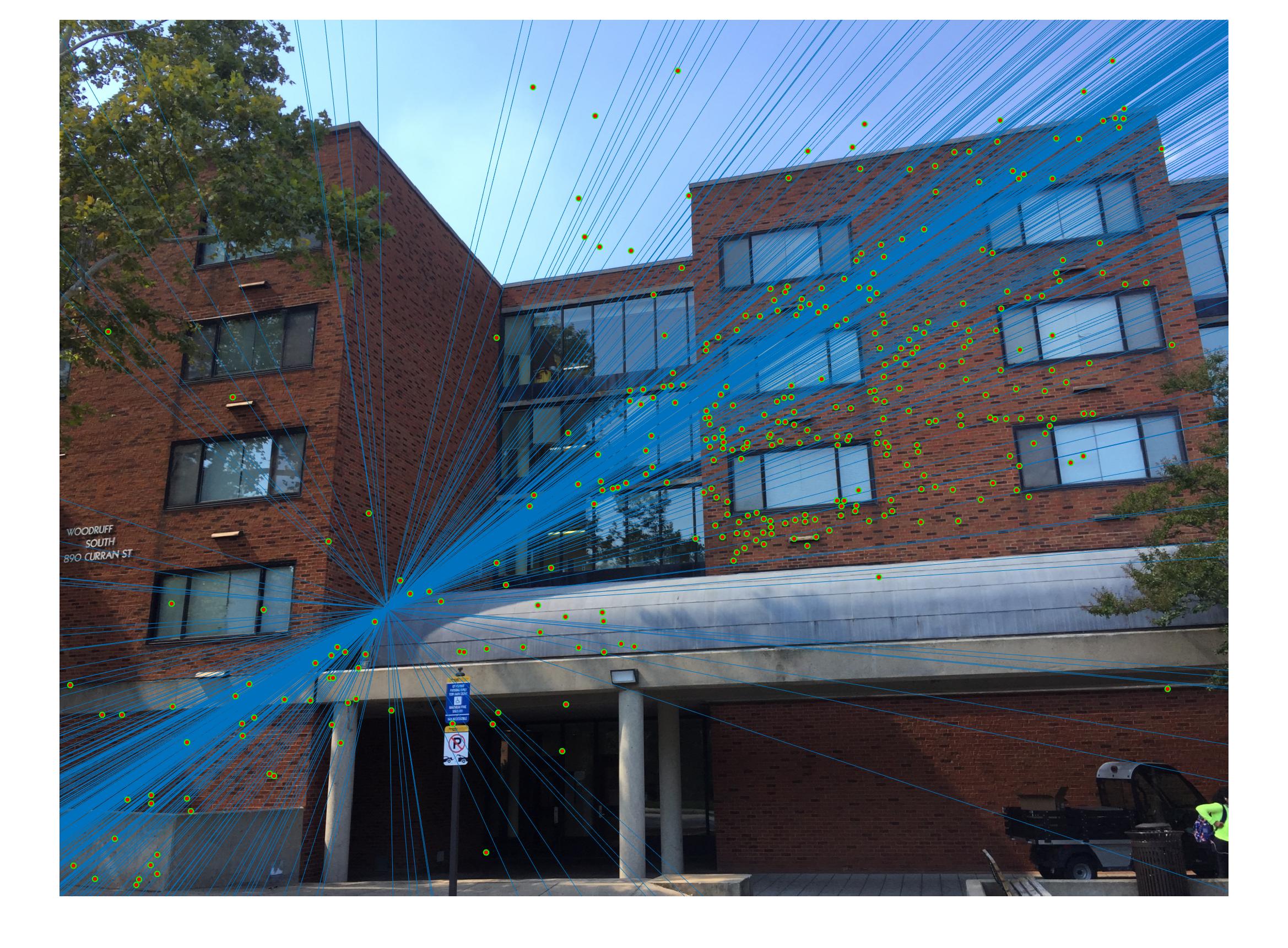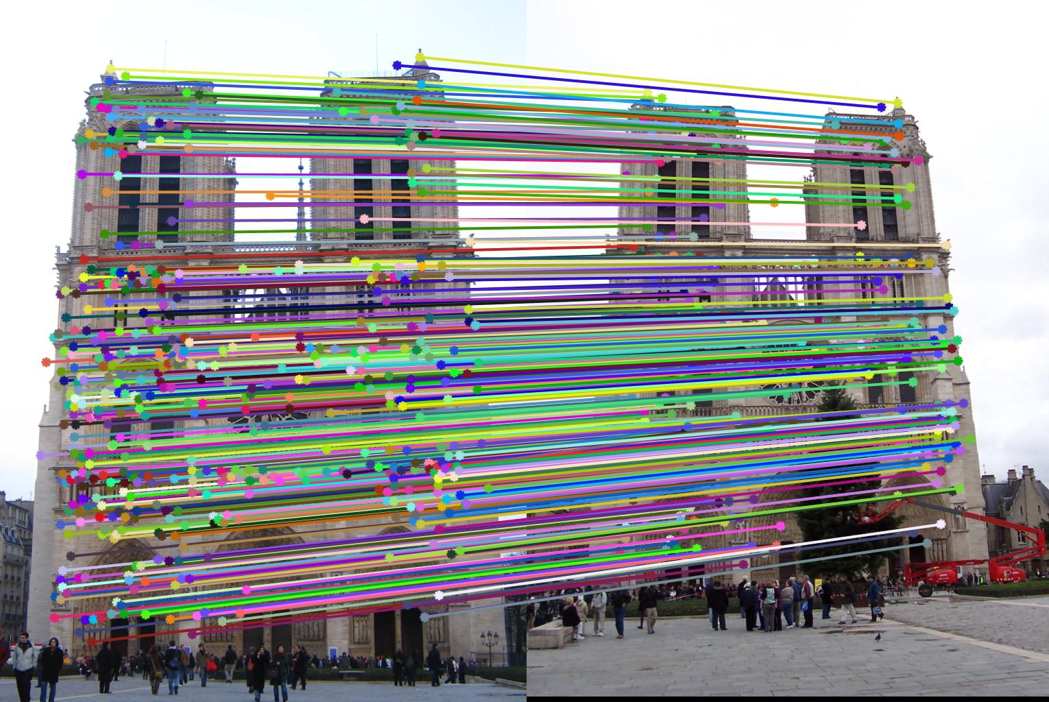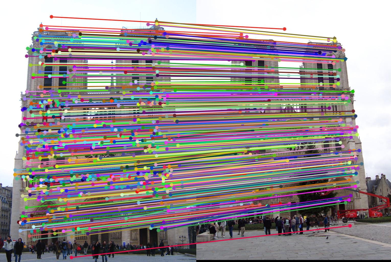 Even with RANSAC and the "best" pair of parameters determined, some difficult images like the Gaudi pair still showed many incorrect correspondences. This is due to the fact that the fundamental matrix that is estimated is "wrong" (as in it implies a relationship between the cameras that must be wrong, e.g. an epipole in the center of one image when the cameras actually have a large translation parallel to the image plane) - project description. The estimated fundamental matrix can be off because of poor numerical conditioning of the image coordinates used to determine our fundamental matrix. That is, of the keypoints returned by SIFT, some of their x and y coordinates can vary signficantly enough that the fundamental matrix becomes ill-conditioned. To address this problem, I proceeded to normalize keypoint coordinates through a linear transformation described by a combination of scaling and translation. That is, we 'normalize' so that the camera center is at the origin, and the points are at most a standard deviation away from the mean (origin). Implemented in estimate_fundamental_matrix() is the following add-on normalization procedure.