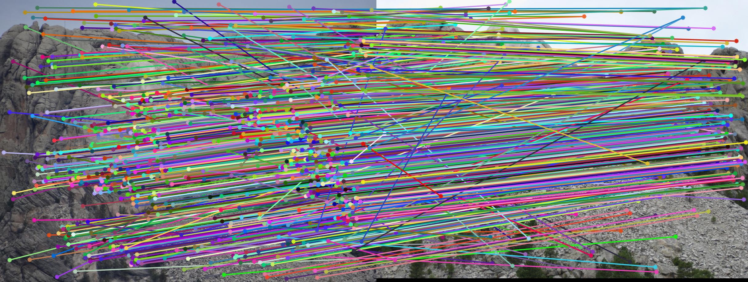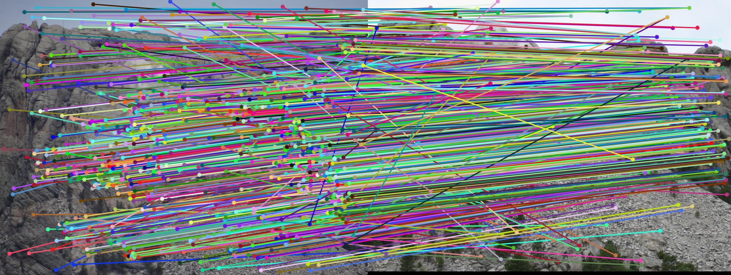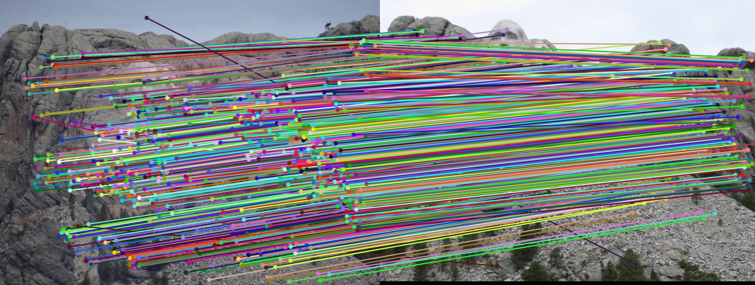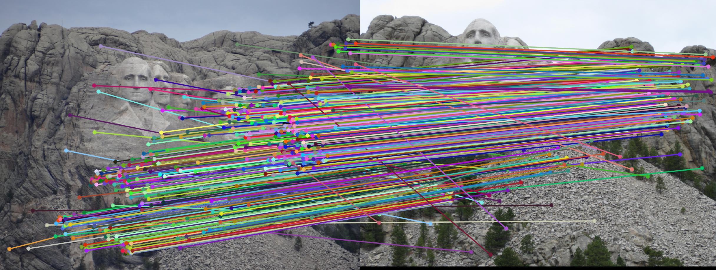 Even with RANSAC and the "best" pair of parameters determined, some difficult images like the Gaudi pair still showed many incorrect correspondences. This is due to the fact that the fundamental matrix that is estimated is "wrong" (as in it implies a relationship between the cameras that must be wrong, e.g. an epipole in the center of one image when the cameras actually have a large translation parallel to the image plane) - project description. The estimated fundamental matrix can be off because of poor numerical conditioning of the image coordinates used to determine our fundamental matrix. That is, of the keypoints returned by SIFT, some of their x and y coordinates can vary signficantly enough that the fundamental matrix becomes ill-conditioned. To address this problem, I proceeded to normalize keypoint coordinates through a linear transformation described by a combination of scaling and translation. That is, we 'normalize' so that the camera center is at the origin, and the points are at most a standard deviation away from the mean (origin). Implemented in estimate_fundamental_matrix() is the following add-on normalization procedure.