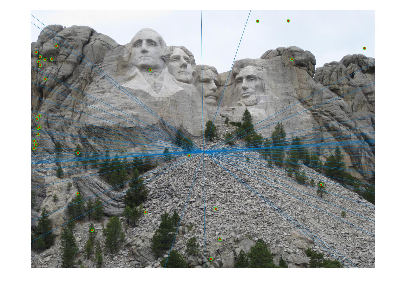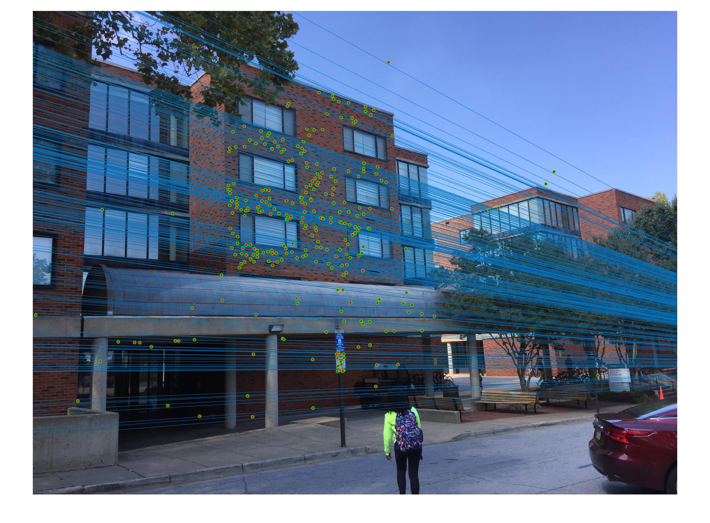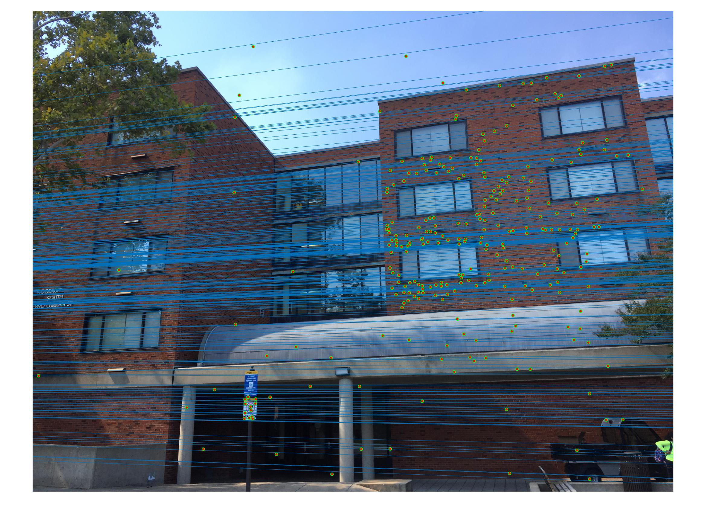 The second stage in the pipeline is to estimate the fundamental matrix using epipolar geometry of the interest points found in the two images. For the sake of performance, SIFT interests points are computed by the VLFeat library functions in this project. Using the fundamental matrix definition provided I was able to construct a linear system of equations that had more variables than the number of equations. Being an overdetermined system it can have an infinite number of solutions so to ensure that we get a non-zero fundamental matrix I had to fix the last element of matrices to 1 to reduce the dimensionality and solve by the linear least squares method suggested in lecture 13 slides. Much like in part 1, many matrix manipulation operators were used to streamline for performance and minimize for loops. Through SVD analysis I was able to drop the smallest singular value of the fundamental matrix so epipolar lines will now instersect at a common point called the epipole. To verify that our fundamental matrix estimation is sensible and useful, see below that epipolar lines are indeed crossing through the corresponding ground truth points in the other image. There is one caveat to note, however, that this fundamental matrix is not the true "correct" fundamental matrix that describes the two perpectives in real life due to limitations in Field of View of a photograph and other factors. Nevertheless in image pairs where planes are strictly defined like the one we see below, the estimated fundamental matrix is does a pretty good job constraining the search space for point correspondences.