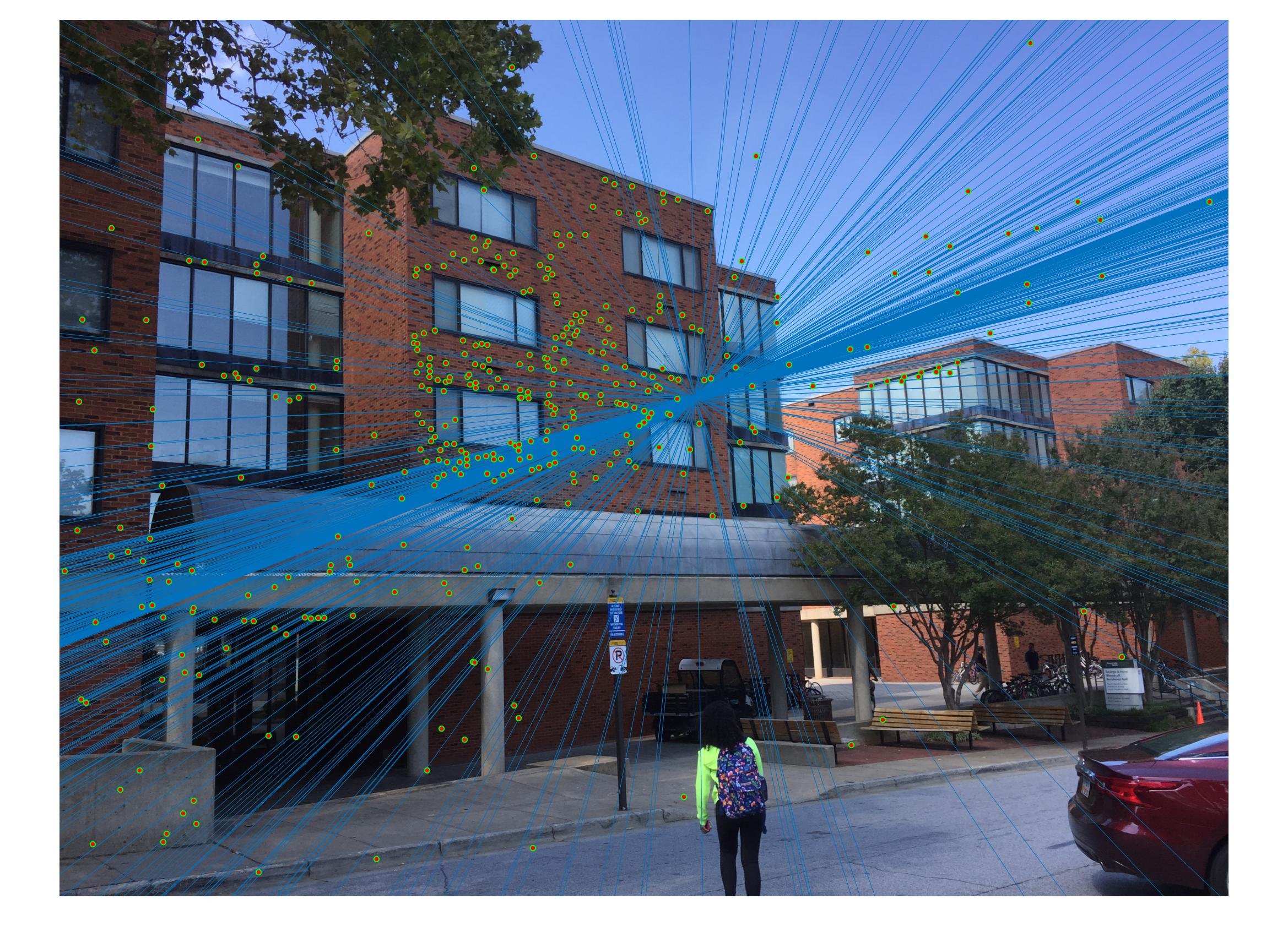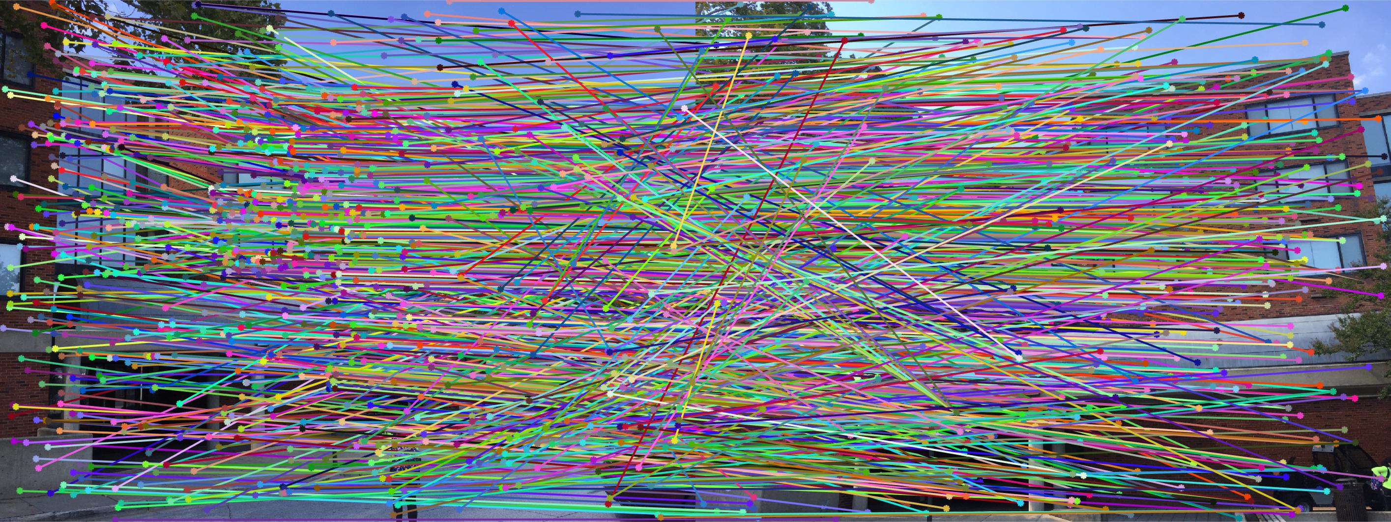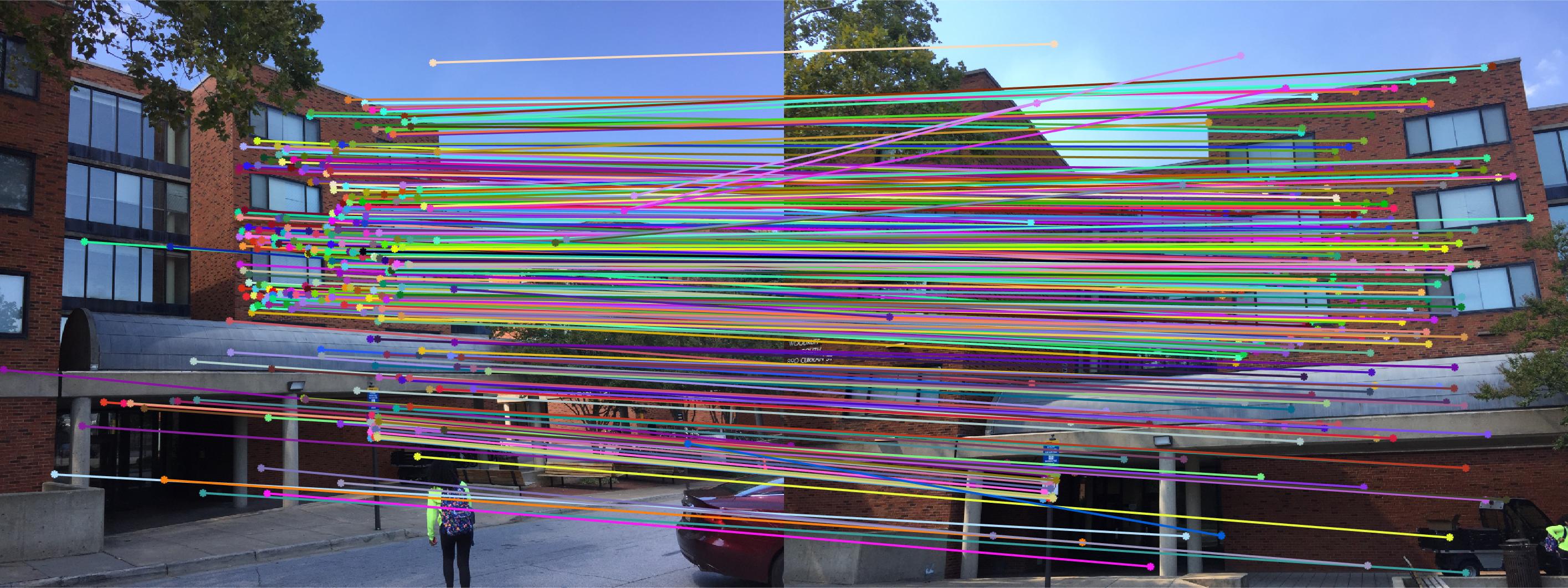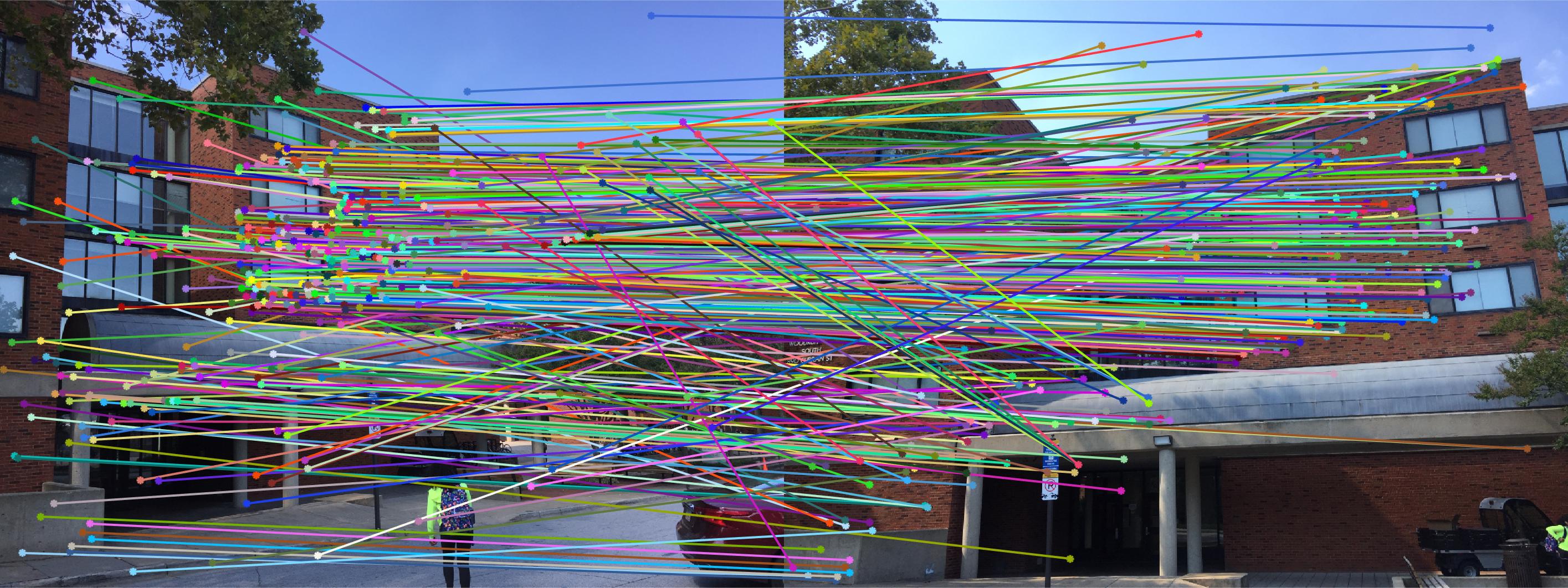 The last stage in the pipeline is to refine the fundamental matrix we found from Part II. As the fundamental matrix could be ill-conditioned and influenced by scale imbalances between the x- and y-axes, the fundamental matrix can be unrepresentative of the transformation from a feature point to its corresponding epipolar line in the other image. This bias may be augmented especially when we have a large number of SIFT keypoints returned to search from (comparison statistics shown at the end). To reject spurious and minimize mismatches, we use the RANSAC algorithm to randomly sample 8 points of all keypoints to generate a different fundamental matrix every iteration. We then find how many inliers are within a threshold of agreement with the fundamental matrix. To determine this level of agreement, we define a distance metric as product x'Fx for a pair of point correspondence (x',x) and fundamental matrix F. Because we know in theory that a proper fundamental matrix of true epipolar points should yield x'Fx = 0, we want to minimize x'Fx for a randomly sampled F. Upon every iteration, we update the maximum number of inliers counted as well as its corresponding fundamental matrix. At the end of the algorithm, we denote this maximum-inlier Fundamental matrix as the "Best Fundamental Matrix" found.