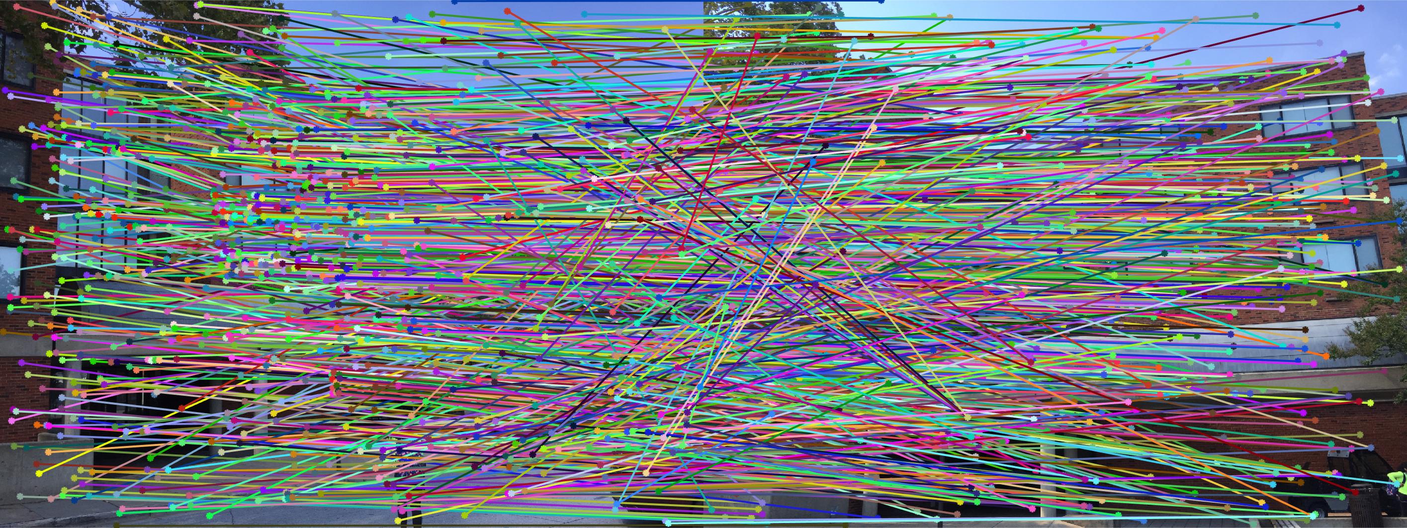 parameters that yielded the most accurate, correct and prolific keypoint correspondences is threshold = 0.03 and #iterations = 1500. This pair of parameters worked quite well for all images tested and is believed to yield strong results with a good balance between outlier minimization and computation efficiency for the general case compared to other parameter combinations like