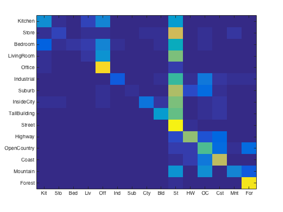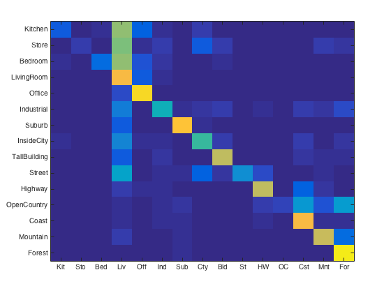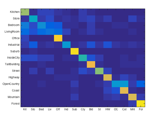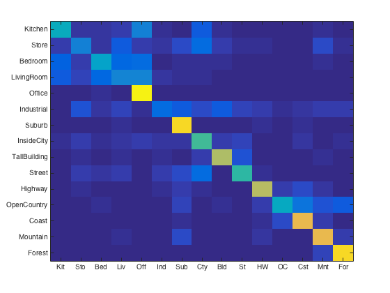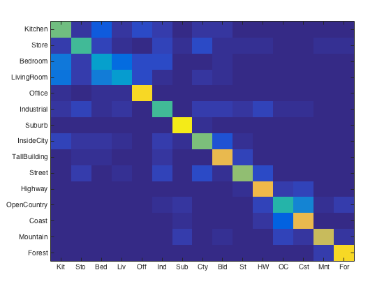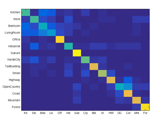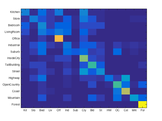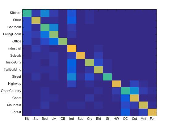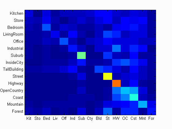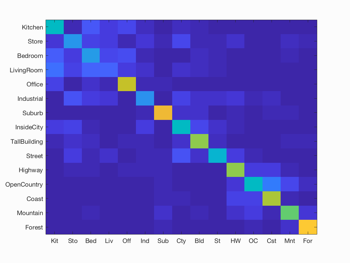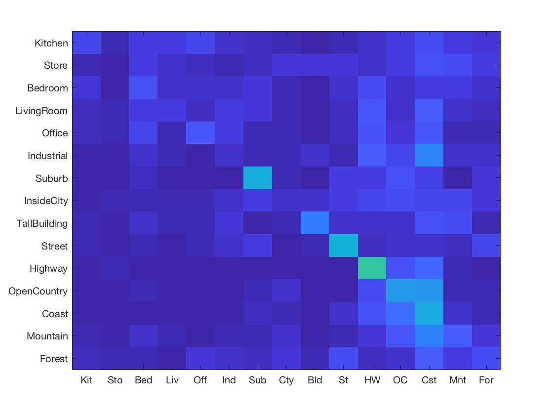 For purposes of verification we test our image recognition algorithm on a database of 15-category images widely used for benchmarking purposes. Each category is represented by 100 images giving a total of 1500 images for our algorithm to "learn" its classification model from. Initially, we showed that compared to the baseline measure, just downsizing the image to a 16x16 framesize along with a nearest neighbor classifier simply gives a naive yet modest accuracy improvement of about 12-15%.